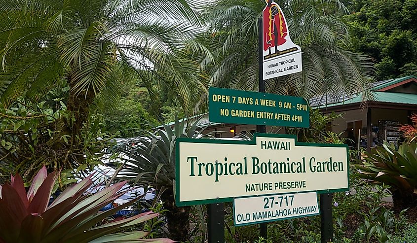 Das Eingangsschild im Hawaii Tropical Botanical Garden, einem gemeinnützigen botanischen Garten in Papa’ikou. Bildnachweis Tada Images über Shutterstock.