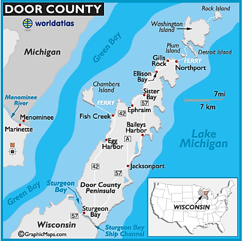 Die Door County-Halbinsel ist landesweit bekannt für ihre unvergleichliche Schönheit und die ideale Lage für Urlaub und Kurzurlaube. Zwei Juwelen von Door County sind die abgeschiedene Sister Bay und die herrlichen Landschaften rund um das Schiffbauzentrum Sturgeon Bay.