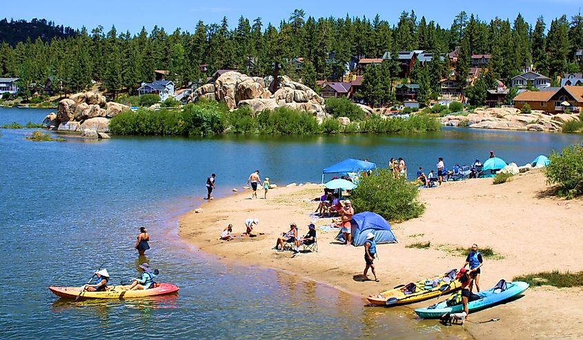 Menschen beim Kajakfahren neben einer Sandstrandbucht in Big Bear Lake, Kalifornien. Bildnachweis photojohn830 über Shutterstock