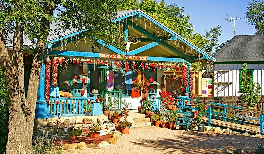 Ein charmanter und farbenfroher Straßenladen in Madrid, New Mexico.