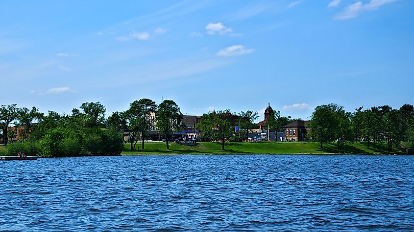 Bemidji, Minnesota – Innenstadt von einem Boot auf dem Bemidji-See an einem sonnigen Tag
