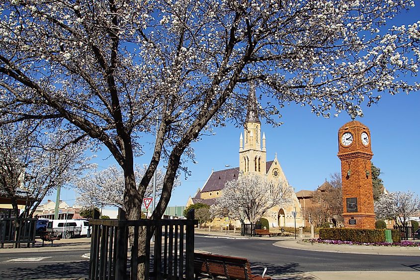 Mudgee, NSW-Kirche und Glockenturm, gesehen hinter einem weißen Kirschblütenbaum, via Annalucia / Shutterstock.com