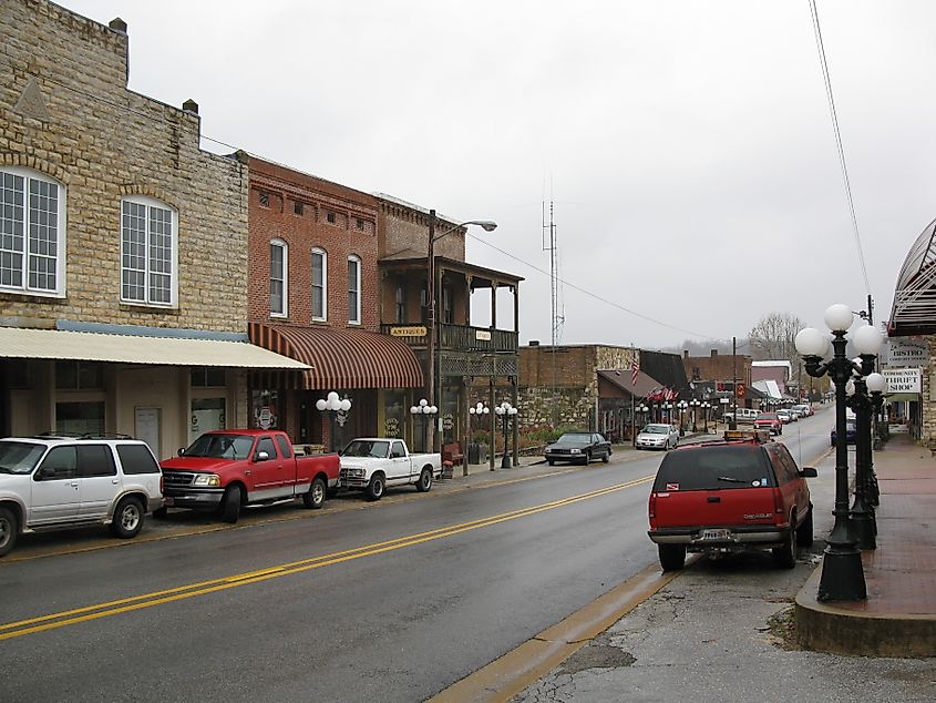 Gebäude entlang einer Straße in Mammoth Spring, Arkansas. Von Drowzy in der englischen Wikipedia, CC BY-SA 3.0, Wikimedia Commons.