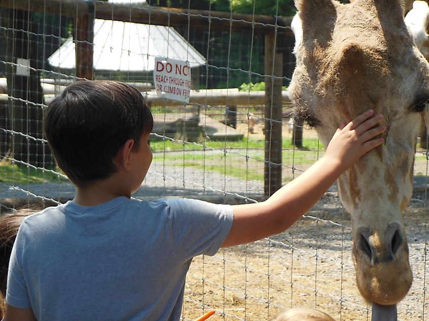 Ein Junge streichelt eine Giraffe im Zoo. Hovatters Wildtierzoo. Foto über WikimediaCommons