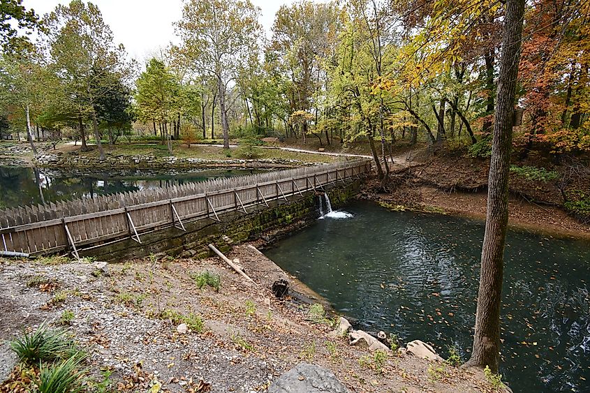 Eine Brücke über Wasser im Blue Spring Heritage Centre in Eureka Springs, Arkansas.