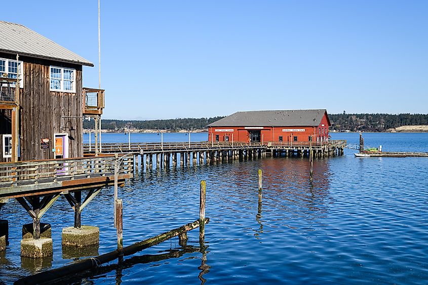 Rotes Holzgebäude am Coupeville Wharf im US-Bundesstaat Washington unter strahlend blauem Himmel mit Blick auf Penn Cove, via Ian Dewar Photography / Shutterstock.com