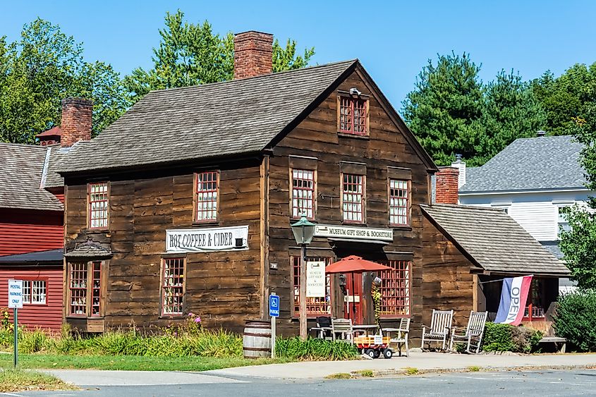 Historisches Holzgebäude, in dem sich der Geschenkeladen und die Buchhandlung des historischen Deerfield Museums befinden. Bildnachweis: Alizada Studios / Shutterstock.com