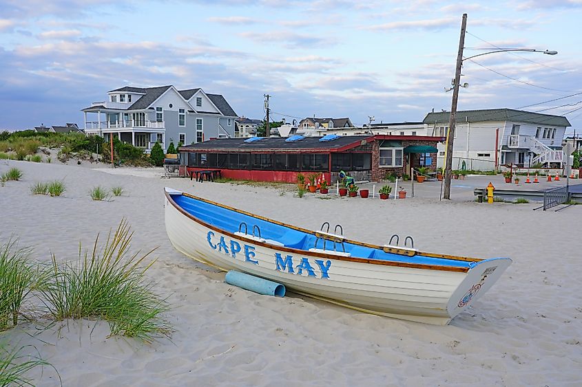Blick auf ein Boot mit einem Cape May-Schild am Strand in Cape May, New Jersey. Bildnachweis: EQRoy / Shutterstock.com.