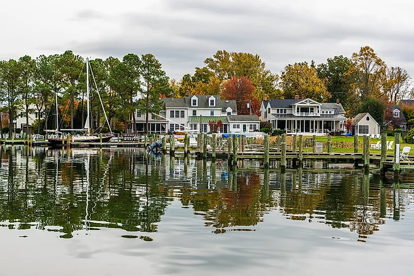 Häuser am Wasser entlang des Hafens in St. Michaels, Maryland.