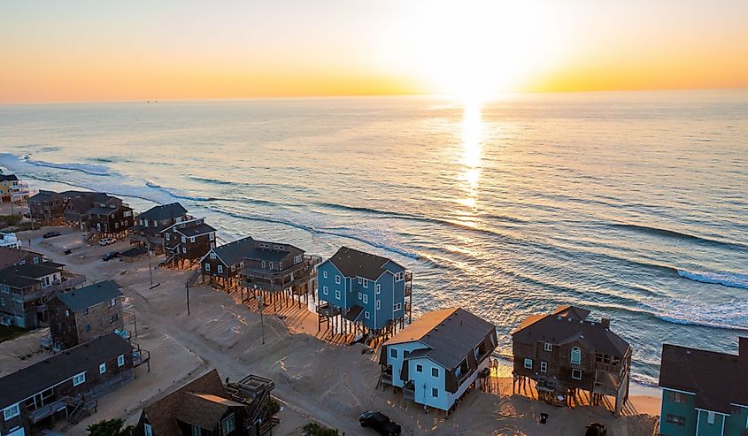 Luftaufnahme von Häusern und dem Meer bei Sonnenaufgang in Buxton, North Carolina.