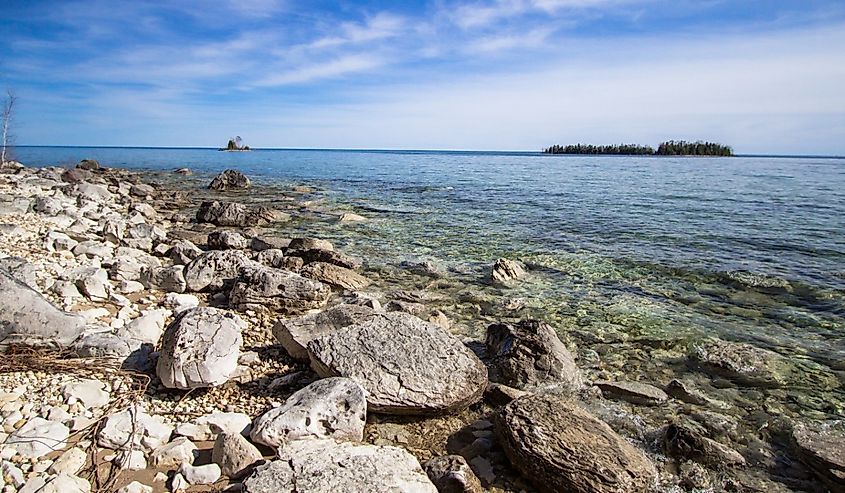 Sonniger Tag an der felsigen Küste des Huronsees mit den Les Cheneaux-Inseln am Horizont.
