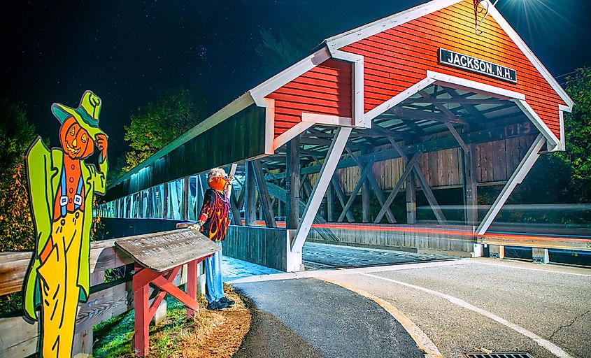 Holzbrücke während Halloween in Jackson, New Hampshire.