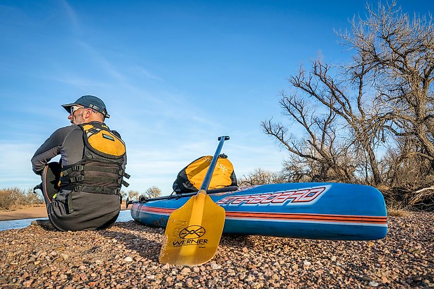 Ein älterer Mann bereitet sich darauf vor, den South Platte River in der Nähe von Kersey zu betreten. Editorial Credit: Marekuliasz / Shutterstock.com