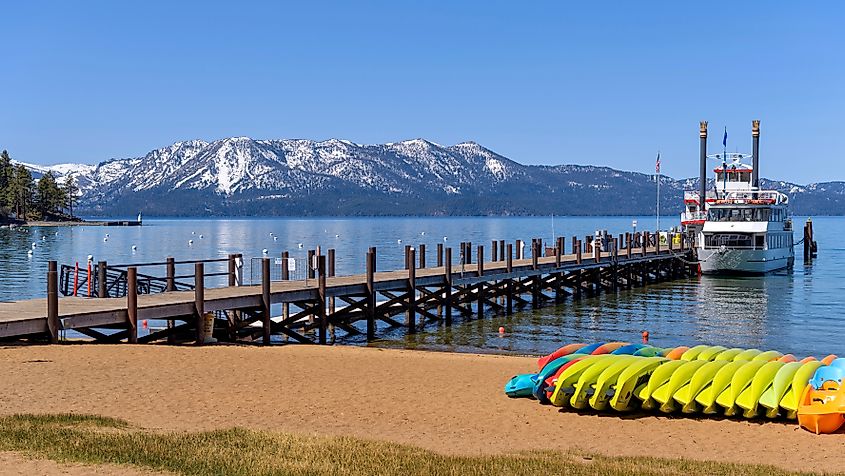 Ein ruhiger, sonniger Frühlingsmorgen am Strand von Zephyr Cove, Lake Tahoe, Kalifornien-Nevada, USA. Bildnachweis: Sean Xu / Shutterstock.com