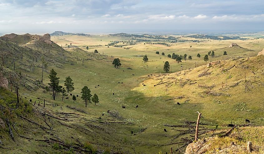 Blick auf den Nebraska National Forest bei Chadron mit Rindern