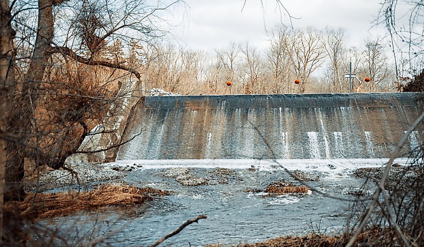 Ein wunderschöner Blick auf einen Wasserfall und blattlose Bäume vor bewölktem Himmel tagsüber am Marshall Riverwalk, Marshall, Michigan.