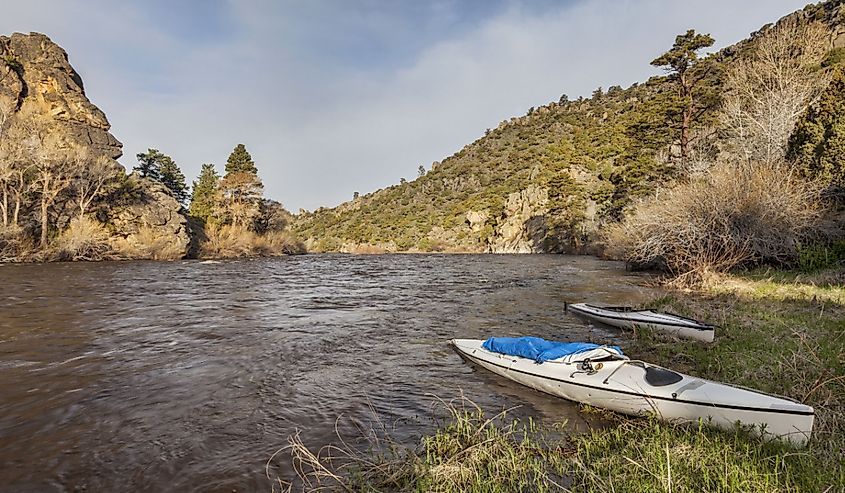 Kanus auf dem North Platte River in Wyoming unterhalb des Campingplatzes Bennet Peak in der Nähe von Saratoga, Wyoming. Bildnachweis: marekuliasz über Shutterstock