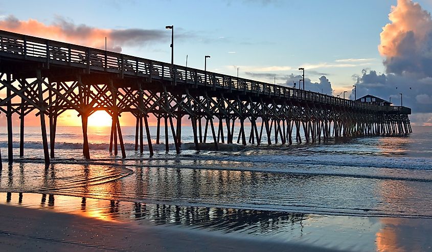 Der Pier in Garden City, South Carolina, während die Sonne über dem Horizont aufsteigt.