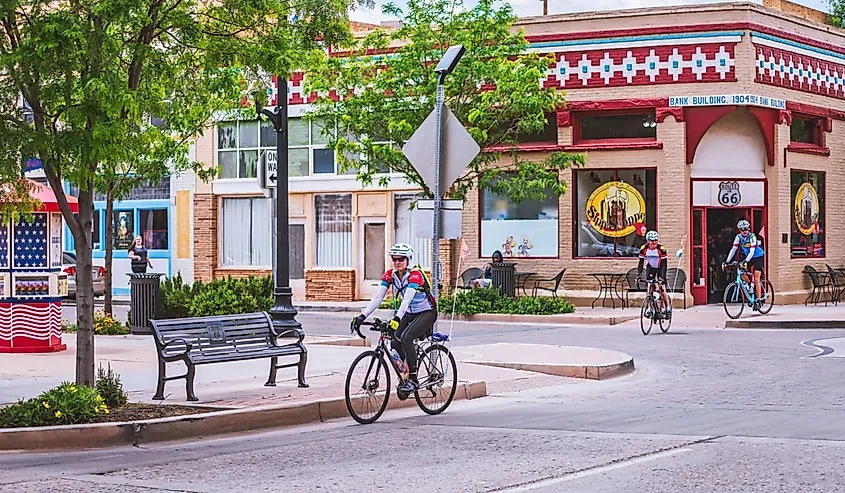 Radfahrer unterwegs auf der Route 66 in Winslow, Arizona. Bildnachweis Terry Kelly über Shutterstock