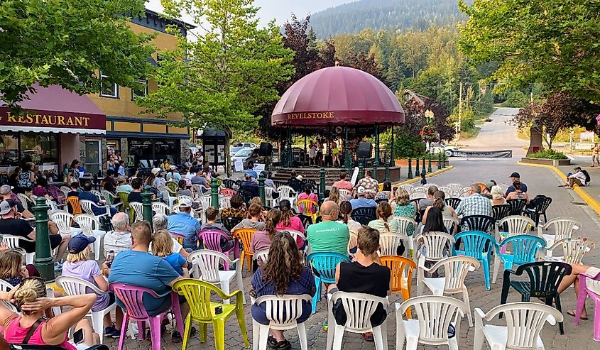 Eine überfüllte Innenstadt mit vielen Menschen, die sitzen und einem Konzert in der Innenstadt von Revelstoke, British Columbia, Kanada, lauschen. Bildnachweis Christopher Babcock über Shutterstock