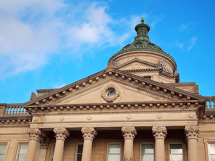 Das Somerset County Courthouse in Pennsylvania hebt seine klassische Giebel-, Kuppel- und Säulenarchitektur in Uptown Somerset hervor. Bildnachweis: duckeesue / Shutterstock.com