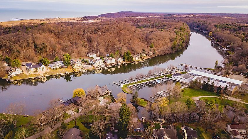 Der Kalamazoo River fließt durch Saugatuck, Michigan.