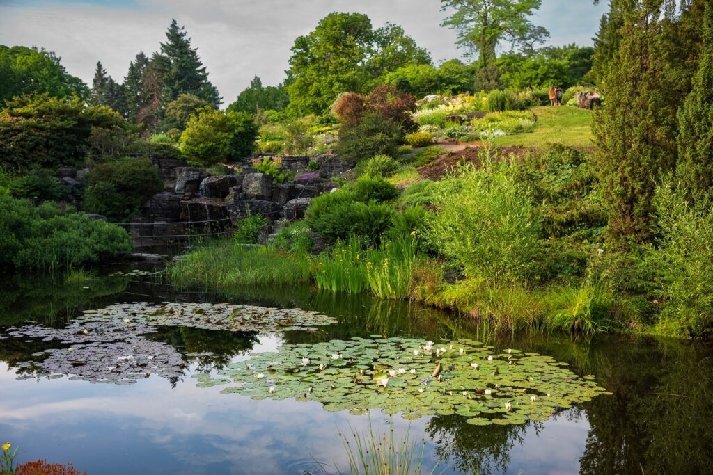 Auch im Arboretum des Botanischen Gartens gibt es eine Fülle von Grünpflanzen – Kirschbäume, Gelbholzbäume, Magnolien, Tauben, Robinien, Linden, Trompetenbäume, Holunder und Scheinorangen. Der alpine Steingarten ist ein stimmungsaufhellender Ort mit einer Miniatur-Berglandschaft mit grasbewachsenen Hängen, felsigen Bergrücken, Wasserspielen, die Wasserfälle imitieren, und einem Teich mit Seerosen.