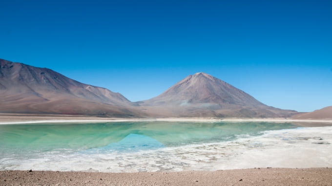 Laguna Verde ist ein Salzsee in der Region Potosi in Bolivien. Es befindet sich am Fuße des Vulkans Licancabur nahe der Grenze zu Chile. Der See ist bekannt für seine aquagrüne Farbe, der Ursprung seines Namens, der auf die Mineralien im See zurückzuführen ist. Mit seiner unglaublichen Farbe und der wunderschönen Bergkulisse bietet Laguna Verde einige der unglaublichsten Landschaften Boliviens und ist auf jeden Fall einen Besuch wert.