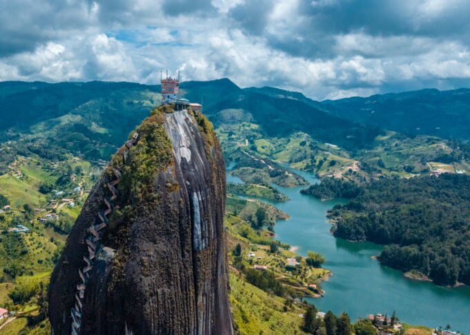 Piedra del Penol in Guatape ist eines der unglaublichsten Sehenswürdigkeiten der Welt. Der Aussichtspunkt oben auf den 700 Stufen bietet einen spektakulären Panoramablick auf die darunter liegende Laguna de Guatape. Es gibt auch Restaurants in der Gegend, in der Sie sitzen können, sich nach dem Klettern der Treppe entspannen und in den wunderschönen Ausblicke auf die Landschaften Kolumbiens zusammen mit dem Blick auf den Felsen selbst einweichen.