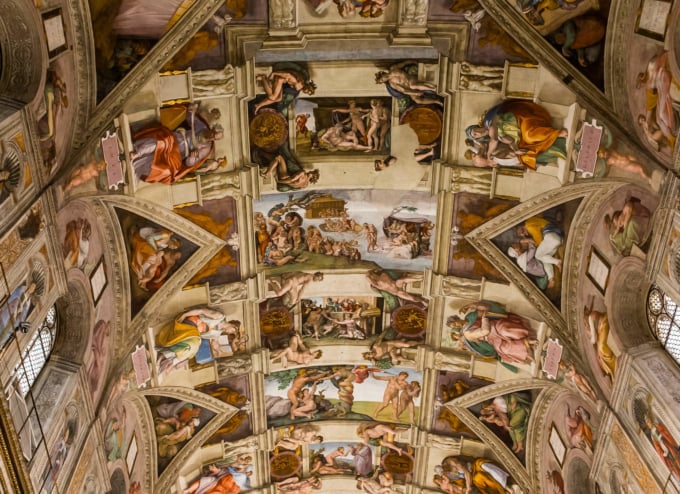 Beim Betreten der Sixtinischen Kapelle fallen einem sofort die riesigen Fresken ins Auge, die die gesamte 40 Meter lange Decke bedecken. Diese von Michelangelo in seinen Dreißigern gemalten Werke – zusammen als „Affreschi di Michelangelo“ bekannt – stellen Szenen aus dem Buch Genesis im Alten Testament dar.