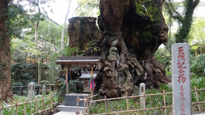 Majestätisch thront hinten links im Hauptschrein der heilige Kampferbaum, der zum nationalen Naturdenkmal erklärt wurde. Dieser Kampferbaum soll mit einem Stammumfang von etwa 24 Metern der größte auf Japans Hauptinsel (Honshu) sein. Es wird angenommen, dass ein einmaliger Spaziergang um seinen Stamm Ihr Leben um ein Jahr verlängert oder Ihnen einen Wunsch erfüllt. Dies zieht das ganze Jahr über unzählige Besucher an.