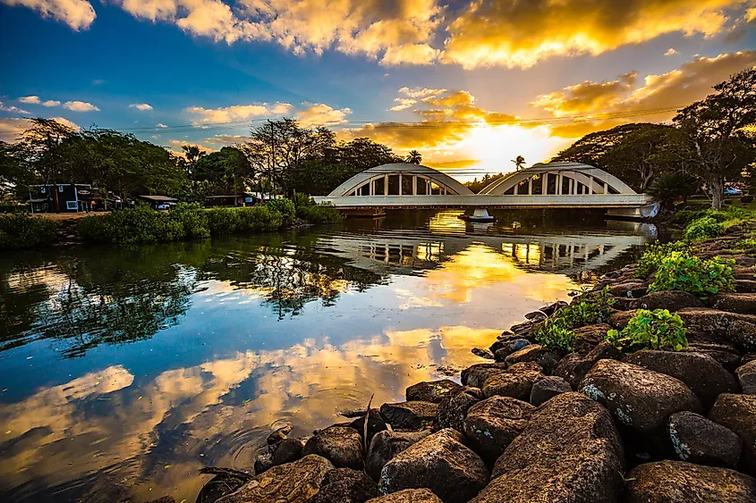 In der Stadt kann man am Ufer entlang schlendern und die Regenbogenbrücke über den Anahulu River überqueren, um die sanfte Aussicht auf die Mangroven zu genießen. Und das Beste: Sie können sich auf dem sanften Abschnitt des Haleʻiwa Beach Park niederlassen, um Paddleboard zu fahren und den Sonnenuntergang zu genießen.