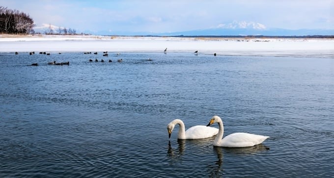 Jährlich besuchen rund 250 Wildvogelarten den See, darunter seltene und gefährdete Arten wie der Seeadler, der Weißkopfseeadler und der Rotkronenkranich. Bei Sonnenuntergang können Sie eine atemberaubende Szene erleben, wenn Vögel ruhen, fliegen und vor dem goldenen Abendhimmel über den See gleiten und so einen filmischen Anblick schaffen. Darüber hinaus finden Sie an der Küstenseite des Tofutsu-Sees den Koshimizu Wild Flower Garden, ein natürliches Blumenfeld. Hier können Sie einen Panoramablick auf den riesigen Tofutsu-See sowie den Berg Shari-dake und die Shiretoko-Bergkette im Hintergrund genießen, umgeben von farbenfrohen Wildblumen.