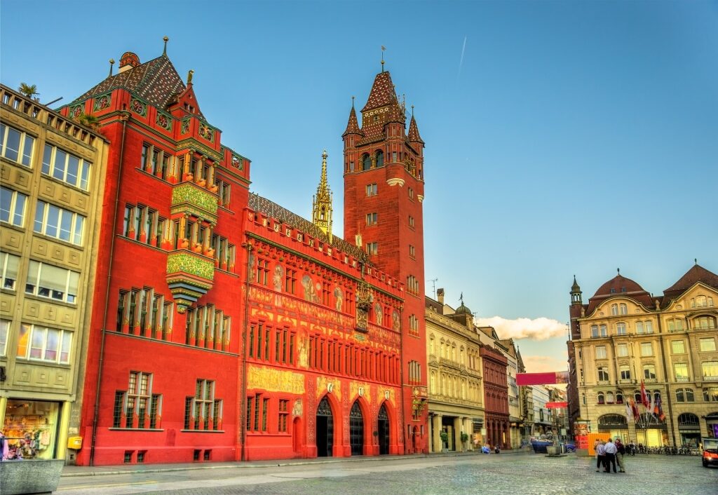 Der Marktplatz ist ein Herzstück von Grossbasel – der Name für den größeren, älteren Teil der Altstadt am südlichen Rheinufer – und ein Marktplatz, der von stolzen Zunfthäusern und dem auffälligen Renaissance-Rathaus umgeben ist.