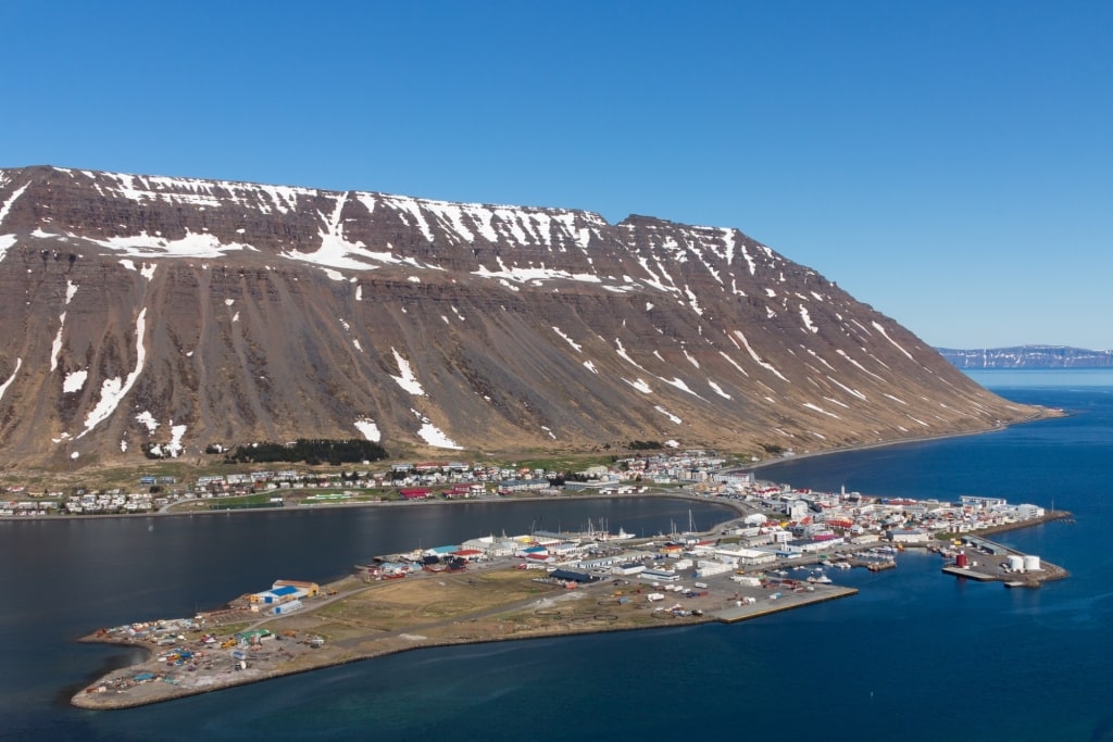 Isafjordur (auf Isländisch Ísafjörður geschrieben und bedeutet „Eisfjord“) liegt am Ende einer tiefen Bucht, Skutulsfjörður. Ein Großteil der kleinen Stadt liegt auf einer geschwungenen Landzunge, die einen riesigen natürlichen Hafen schützt.