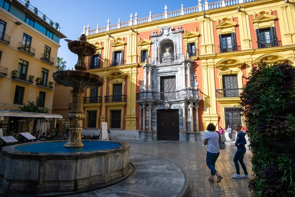 Gegenüber der Kathedrale ist der Palacio Episcopal oder Bischofspalast, eine blockdeckende Ansammlung von Gebäuden, nicht zu übersehen. Es ist an seiner auffälligen senf- und purpurroten Barockfassade erkennbar und eines der bedeutendsten Denkmäler Málagas aus dem 18. Jahrhundert.
