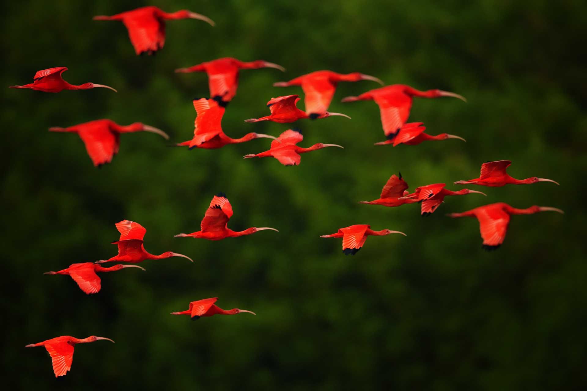 „Kurz vor Einbruch der Dunkelheit machten wir an einer offenen Wasserstelle halt und warteten. Einer nach dem anderen, dann in immer größerer Zahl, blitzten purpurrote Federn durch den Himmel. Die scharlachroten Ibisse kamen zum Schlafen nach Hause und verwandelten das smaragdgrüne Laub in einen Weihnachtsbaum, der mit leuchtend roten Ornamenten geschmückt war. Eine der besten Erfahrungen meines Lebens.“