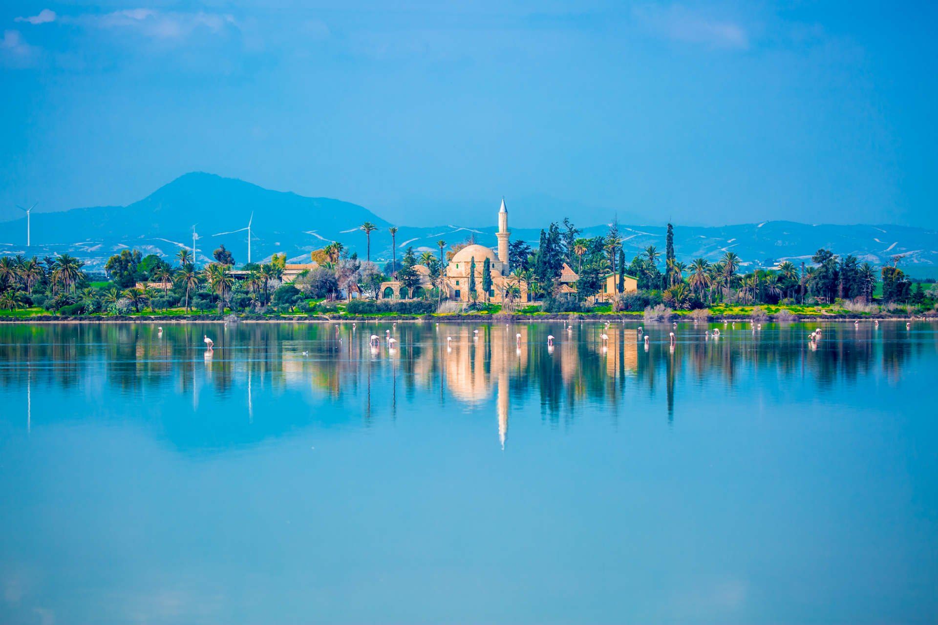 Am Ufer am anderen Ende des Salzsees von Larnaka befindet sich eine der wichtigsten muslimischen Stätten Zyperns, die Hala-Sultan-Tekke-Moschee. Mit ihren eleganten Kuppeln und dem Minarett, das aus einem Palmen- und Zypressenhain am schimmernden Ufer des Sees hervorragt, ist die Moschee äußerst stimmungsvoll und wird nur geringfügig von den störenden Windturbinen am Hang dahinter getrübt.