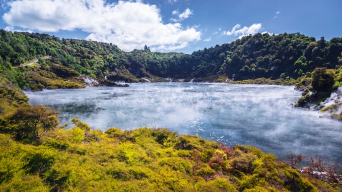 Das Waimangu Volcanic Valley ist einer der besten Orte in Rotorua, um die geothermische Attraktion zu besichtigen. Die Attraktionen für Besichtigungen reichen von der Beobachtung der größten heißen Quelle der Welt in wunderschöner natürlicher Umgebung. Touristen können an der Erkundung der Gegend rund um das Tal teilnehmen und die rauchgefüllten Krater und farbenfrohen Terrassen beobachten. Die Wanderwege machen Spaß und schlängeln sich entlang der Küste des Rotomahana-Sees, wo man eine Bootsfahrt unternehmen kann. Erleben Sie einen historischen Moment, indem Sie eine fast einstündige Fahrt zu einem sehenswerten Ort unternehmen, der einst als achtes Weltwunder bekannt war. Sehen Sie sich die Terrassen in den Farben Rosa und Weiß an.