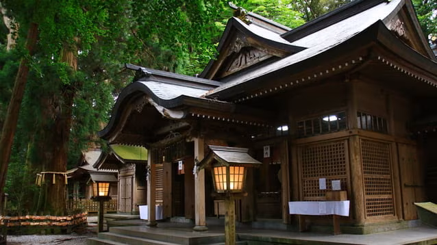 Der Takachiho-Schrein ist einer der repräsentativsten Schreine Kyushus. Seine Haupthalle und die darin untergebrachten eisernen Komainu (Wächter-Löwenhunde) sind als wichtige Kulturgüter registriert. Man sagt, dass es Segen für die Ehe und ein harmonisches Familienleben schenkt, und man geht davon aus, dass Paare oder Verliebte sich ihre Wünsche nach guten Beziehungen, Sicherheit im Haushalt und Wohlstand der Nachkommen erfüllen, wenn sie sich an den Händen halten und drei Runden um zwei Zedernbäume namens „Meoto-sugi“ laufen. Angesichts des Rufs von Takachiho als Kraftort können Sie reichlich Segen erwarten.