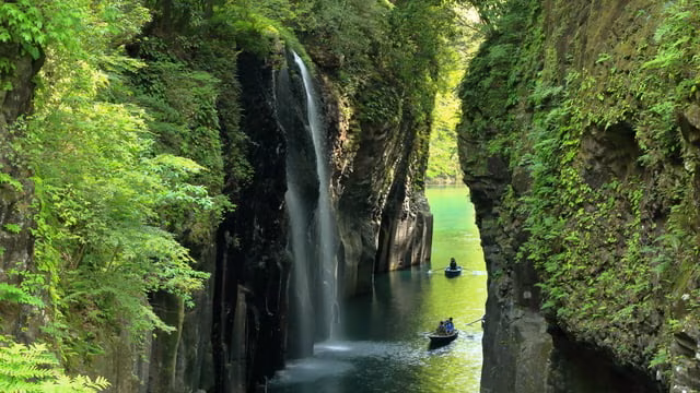 Die Takachiho-Schlucht ist ein staatlich anerkannter Aussichtspunkt und Naturdenkmal. Sein Herzstück, „Manai no Taki“, wird zu einem der 100 besten Wasserfälle Japans gewählt. Der Wasserfall, der etwa 17 Meter in die Tiefe stürzt, ist einfach atemberaubend! Eine beliebte Möglichkeit, die Kraft der Wasserfälle zu erleben, ist eine Ruderbootfahrt aus nächster Nähe. Wenn Sie über die 7 km lange, steile Felswand nach oben blicken, werden Sie ein unvergessliches Erlebnis erleben.