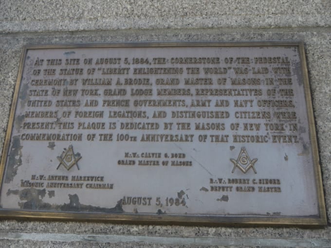 Auf dem Sockel der Freiheitsstatue gibt es eine Plakette, die das Geschenk der französischen Freimaurerei an die New Yorker Freimaurerei feststellt. Dies ist von außen zu sehen. Schauen Sie sich es also an.