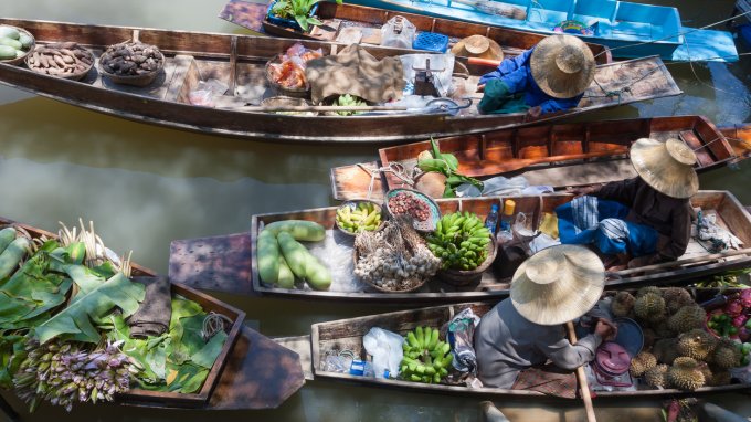 Obwohl in Thailand zahlreiche schwimmende Märkte verteilt sind, ist Damnoen Saduak einer der größten der Welt und garantiert die Stundenreise aus Bangkok. Diese lebhafte Wasserstraße, die mit mit Waren beladenen Booten gefüllt ist, ist eine perfekte Einführung in eine verblassende Art des traditionellen Lebens. Probieren Sie unbedingt die örtlichen Bootsnudeln (Kway Teow Reua) und Kanom Krok, eine Art Dessert aus Kokosnuss.