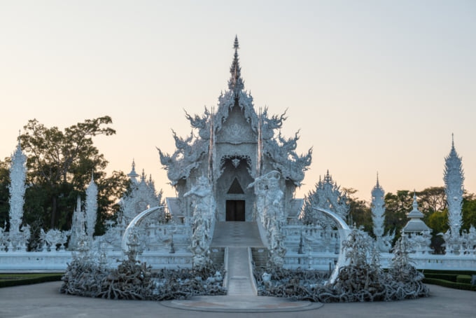 Wat Rong Khun oder allgemein bekannt als der weiße Tempel, ist einer der berühmtesten aller Tempel oder "Wat" in Thailand, ein optisch atemberaubender moderner buddhistischer Tempel in der Provinz Chiang Rai. Erst kürzlich im Jahr 1997 fehlt der Tempel in der Geschichte, es macht ihm in seinem auffallend schönen Design aus. Der lokale Künstler Chalermchai Kositpipat hat den Bau des Tempels mit über einer Million Dollar seines eigenen Geldes entworfen und privat finanziert. Eine genauere Überprüfung der Struktur wird das intensive Detail und das künstlerische Flair aufzeigen, das in dieses exquisite architektonische Meisterwerk investiert wurde.