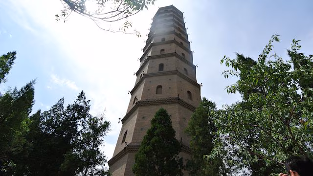 Die Pagode ist achteckig, besteht aus 11 Stockwerken und ist 64,5 m hoch. Es ist die höchste Backsteinpagode im Autonomen Gebiet Ningxia der Hui. Im Inneren der Pagode führt eine sehr schmale Wendeltreppe nach oben. Die Treppe ist nur breit genug für eine Person. Wenn Sie also an anderen Besuchern vorbeikommen, müssen Sie auf einen Treppenabsatz steigen und warten. Ganz oben genießen Sie einen Panoramablick auf Yinchuan, wo sich moderne Wolkenkratzer und traditionelle Gebäude vermischen und die Entwicklung der Stadt offenbaren.
