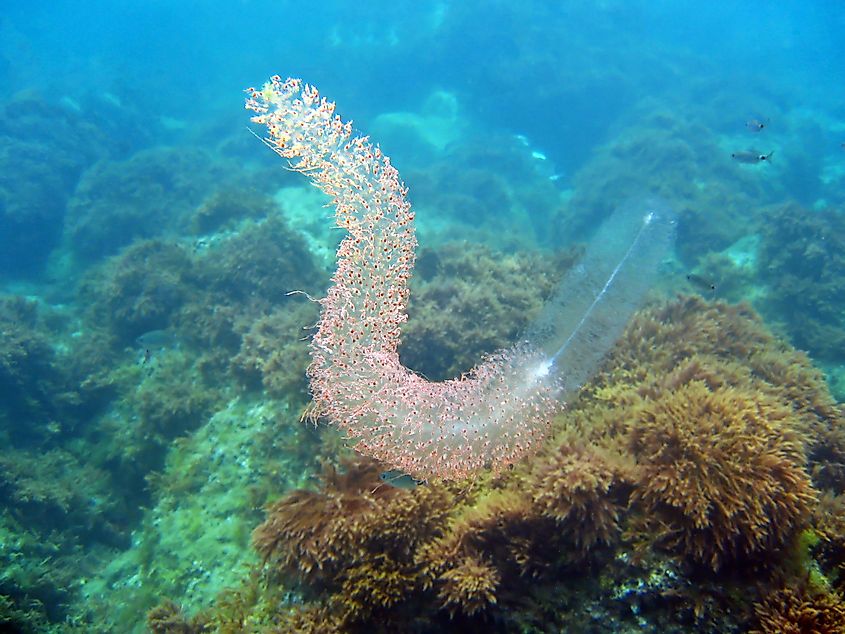 Blauwale sind mit einer Länge von bis zu 110 Fuß (33,5 m) die schwersten Lebewesen aller Zeiten und gehören zu den längsten im Ozean. Die Löwenmähnenqualle, die ihre Tentakel über 120 Fuß ausdehnen kann, kann manchmal mit der Länge eines Wals mithalten. Doch Siphonophore übertreffen beide Lebewesen und können über 130 Fuß (40 m) messen.