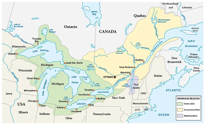 Die wichtigsten Glieder dieser Kette sind die Flüsse St. Marys, St. Clair, Detroit, Niagara und St. Lawrence. Zusammen transportieren sie Wasser vom Lake Superior zum Lake Huron, weiter zum Lake Erie, in den Lake Ontario und hinaus in den Atlantik.