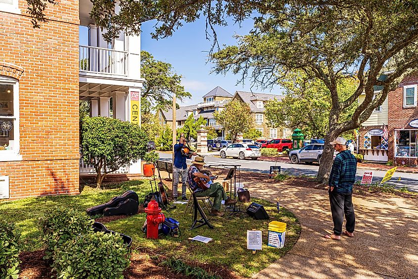 Eine musikalische Darbietung an einem Samstagmorgen in der Innenstadt von Manteo, über Wileydoc / Shutterstock.com