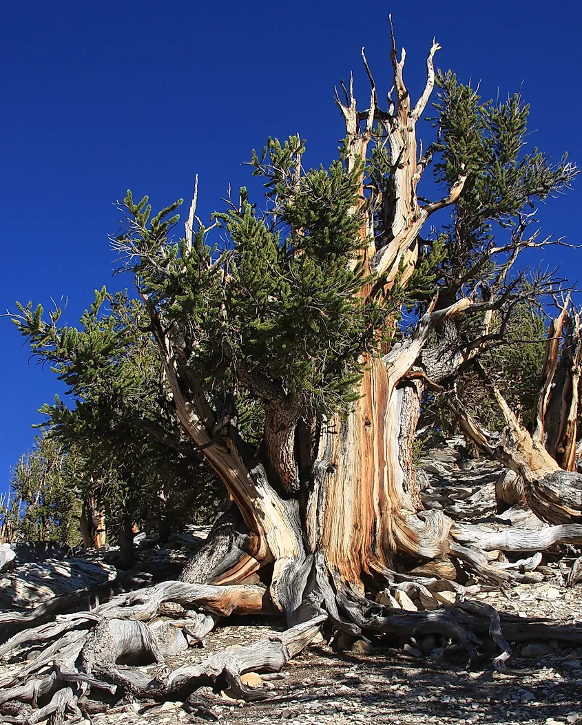 Eine große Great Basin Bristlecone Pine Pinus longaeva, die sowohl lebende als auch tote Abschnitte sowie gestreifte Maserungsfarben auf einem breiten Stamm zeigt. Bildnachweis: dcrjsr über Wikimedia Commons