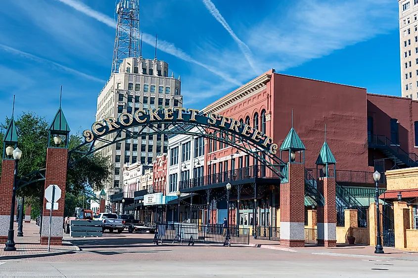 Historischer Speise- und Unterhaltungskomplex Crockett Street in der Innenstadt von Beaumont, Texas. Bildnachweis: Gchapel / Shutterstock.com